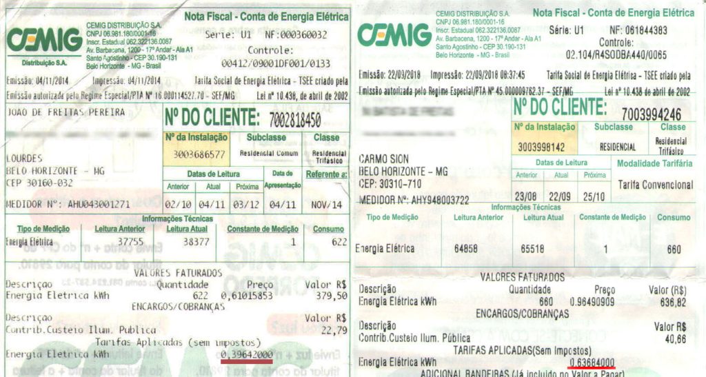 Em novembro de 2014, o valor do kw de energia da CEMIG era 0,3964200, menos de quarenta centavos.