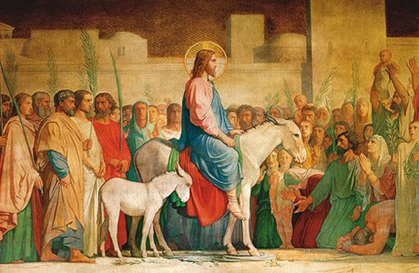 Indo, pois, os discípulos e fazendo como Jesus lhes ordenara, trouxeram a jumenta e o jumentinho, e sobre eles puseram os seus mantos, e Jesus montou. E a maior parte da multidão estendeu os seus mantos pelo caminho; e outros cortavam ramos de árvores, e os espalhavam pelo caminho. E as multidões, tanto as que o precediam como as que o seguiam, clamavam, dizendo: Hosana ao Filho de Davi! Bendito o que vem em nome do Senhor! Hosana nas alturas!