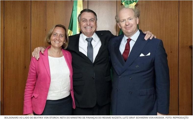 Bolsonaro ao lado de Beatrix Von Storch, neta do ministro de Finanças do regime nazista, Lutz Graf Schwerin von Krosigk. Foto: Reprodução