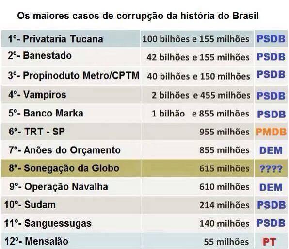O escândalo do mensalão é o menor em valor monetário de todos os doze casos de corrupção aí elencados, e a quase totalidade deles vem do PSDB, donde a falta de apuração.