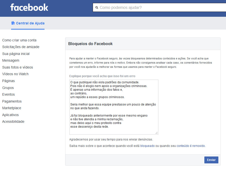 Preenchi o formulário informando por que minha postagem não estava violando os padrões da rede,