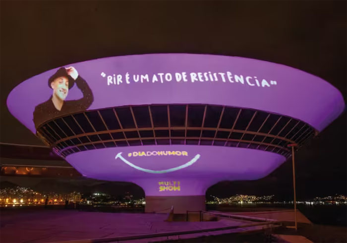 Em Niterói, cidade natal do ator, uma projeção mapeada iluminou a fachada do Museu de Arte Contemporânea, com o rosto e frase de Paulo Gustavo. (foto acima)