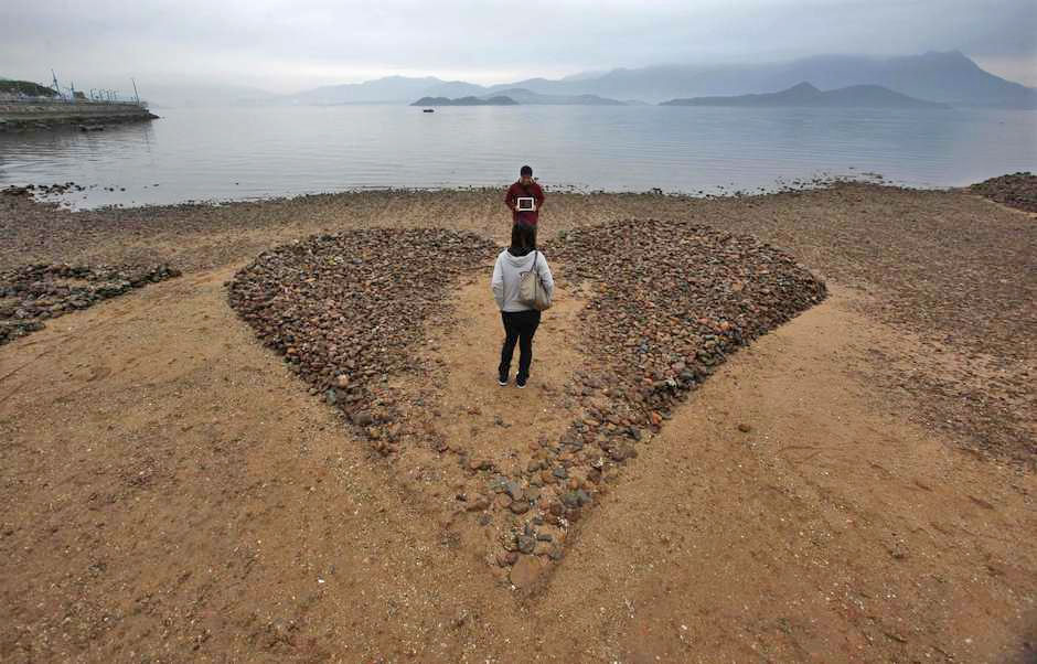 Homem exibe tela de tablet com a frase “eu te amo”, em chinês, para a namorada em meio à escultura de coração em praia de Hong Kong. Diversos casais ao redor do mundo comemoram em 14 de fevereiro o Valentine’s Day, o dia de São Valentim, mas mais conhecido como o Dia dos Namorados