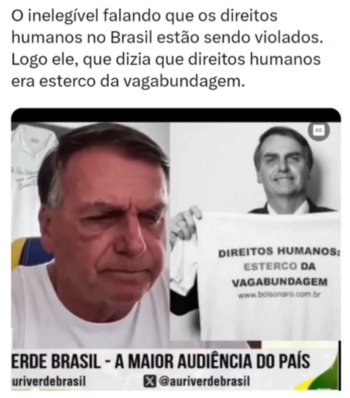 O inelegível falando agora que os direitos humanos no Brasil estão sendo violados! Logo ele, que dizia que direitos humanos era esterco da vagabundagem.