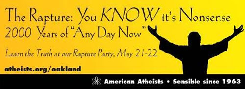 Organizações ateístas dos Estados Unidos resolveram se manifestar contra anúncios feito pela Family Radio que apregoa que o arrebatamento acontecerá no dia 21 de maio.
