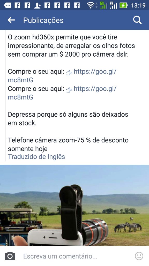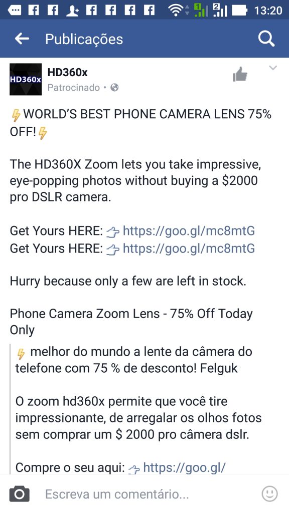 Essa propaganda diz que “O Zoom hd360x permite que você tire fotos impressionantes, de arregalar os olhos, sem comprar uma câmera por $2000 (dois mil dólares)”.