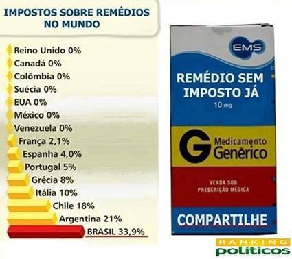 Abaixo vem uma tabela que encontrei no Facebook com a lista de alguns dos países mais conhecidos e seus impostos em relação aos medicamentos. Vários países isentam os medicamentos de tributos. Até a Colômbia e a Venezuela têm os medicamentos sem impostos, e o nosso país é o campeão de impostos sobre remédios!