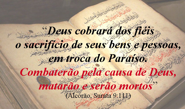 “Deus cobrará dos fiéis o sacrifício de seus bens e pessoas, em troca do Paraíso. Combaterão pela causa de Deus, matarão e serão mortos” (surata 9:111).