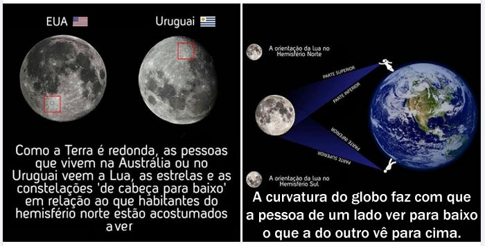 E a prova de que nosso globo está girando é o fato de vemos essa cratera no mesmo lugar do nascer ao pôr da lua e vemos o mesmo lado dela, apenas o vendo invertido de acordo com lado do globo em que estamos. Se a Terra fosse plana, nós veríamos lados diferentes da Lua de diferentes pontos da Terra.