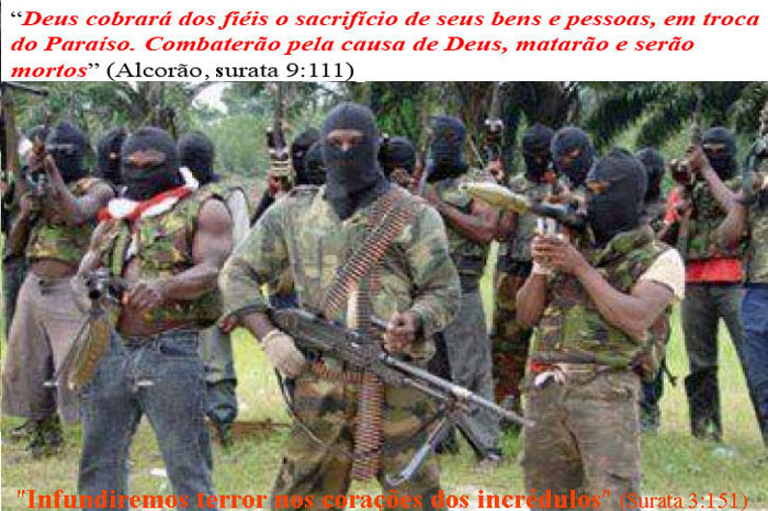 “Deus cobrará dos fiéis o sacrifício de seus bens e pessoas, em troca do Paraíso. Combaterão pela causa de Deus, matarão e serão mortos” (Alcorão, Surata 9:111)!!!