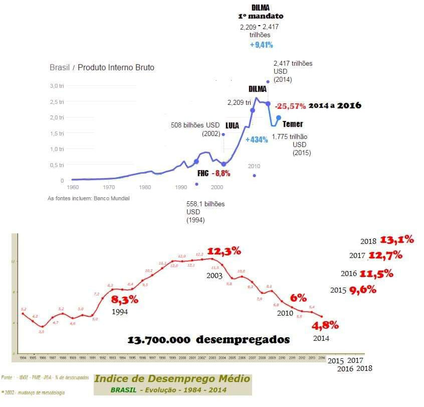 Desde o começo do golpe de Aécio e Cunha em 2015, o desemprego, que já havia caído para 4,8%, subiu vertiginosamente; mas as medidas de Temer vieram para agravar mais um pouco, e no último ano de Temer, o desemprego chegou ao mais da história: 13,1%. A economia chegou a um ponto que só poderia piorar com Bolsonaro.