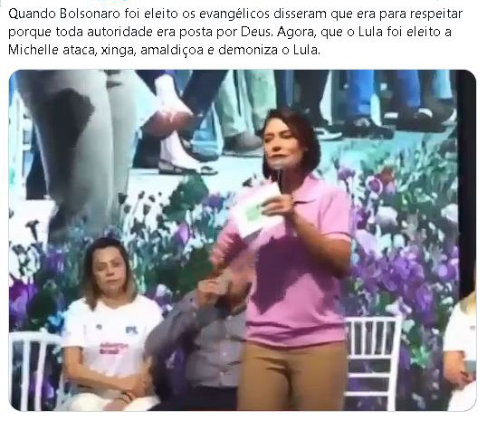 Quando Bolsonaro foi eleito os evangélicos disseram que era para respeitar porque toda autoridade era posta por Deus. Agora, que o Lula foi eleito, a Michelle ataca, xinga, amaldiçoa e demoniza o Lula.