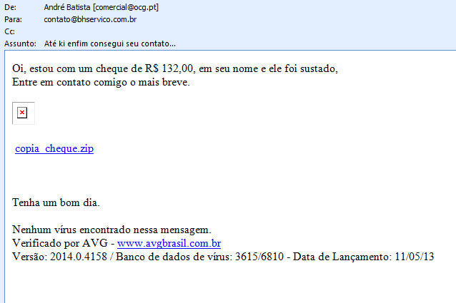 Aí é que está o perigo que não é detectado pelo Antivírus. Se alguém clicar para ver a cópia do cheque, estará baixando algum aplicativo que poderá pescar informações para furtar ou causar algum outro dano.