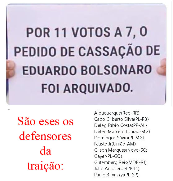 Por 11 votos a 7, o Conselho de Ética da Câmara arquivou o pedido de cassação de Eduardo Bolsonaro. Com todas as ameaças ao país, as faltas ao trabalhos, com as muitas infrações que justificam a perda do mandato.