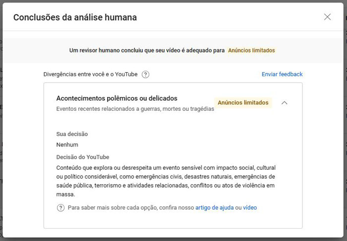 Meses depois, o Youtube removeu a restrição ao meu vídeo.