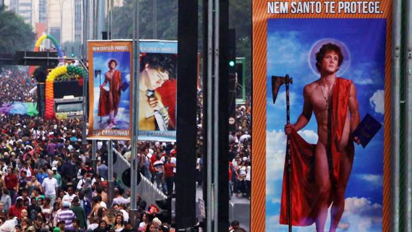 Em 170 cartazes distribuídos em postes por todo o trajeto, 12 modelos masculinos, representando ícones como São Sebastião e São João Batista, apareciam seminus ao lado das mensagens “nem santo te protege” e “use camisinha”.
