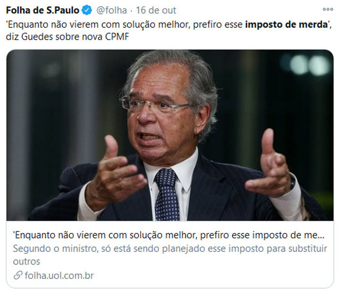 Enquanto o pobre que ganha um salário mínimo pagaria R$2,09 de CPMF, o Paulo Guedes, ao fazer uma transação bancária de R$10.000.000,00, pagaria R$20.000,00, e o banco dele pagaria dois milhões sobre cada bilhão.