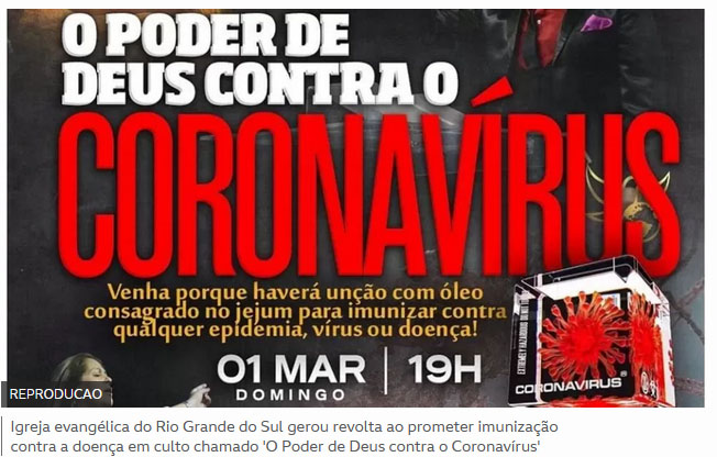Igreja evangélica do Rio Grande do Sul gerou revolta ao prometer imunização contra a doença em culto chamado ‘O Poder de Deus contra o Coronavírus‘