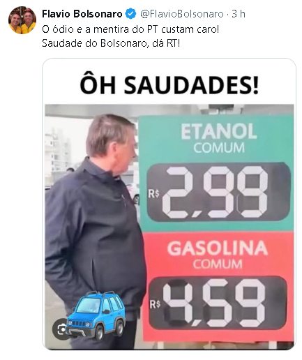Será que ele está mais uma vez apostando na falta de memória do povo para conseguir algum apoio ao pai? Será que ele acha que o povo esqueceu o preço a que chegou a gasolina no último ano do desgoverno Bolsonaro?