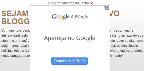 Não é verdade. Você clica, abre uma página do Google Adwords e, quando volta, o banner continua lá, acompanhando a rolagem da página, e em cima do texto, sem opção para fechar. É uma mentira, contra a política de publicidade do Google. Não é como os meus anúncios do Google adsense, que rolam ao lado do texto e não têm nenhuma recomendação para alguém clicar.