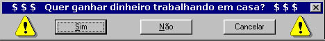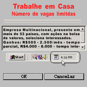 Certa vez acessei uma página erótica e, quando fui fechá-la, apareceu um script, onde li: “QUER SAIR DO SITE? – SIM – NÃO”. Sem prestar atenção cliquei em sim. Quando fui abrir uma nova janela, em vez de abrir a minha página, surgiu aquela página do script. Fechei-a e observei que a pergunta em letras grandes havia sido adicionada para enganar o internauta, mas a verdade estava em letras bem pequeninas: “Quer que esta página seja a inicial do seu browser?”.