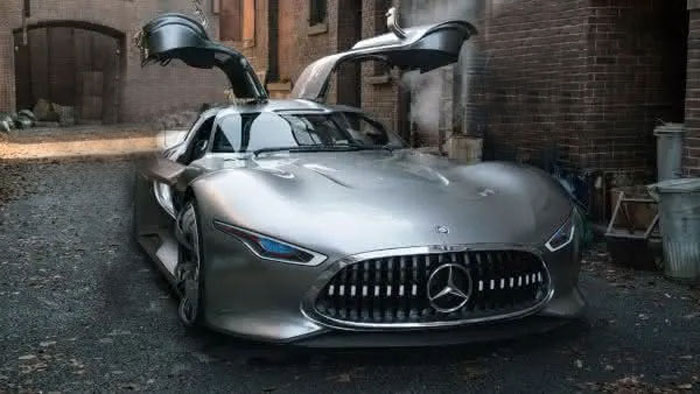 Uma senhora entra em uma concessionária Mercedes. Ela olha ao redor, então acha o carro perfeito e começa a examiná-lo.