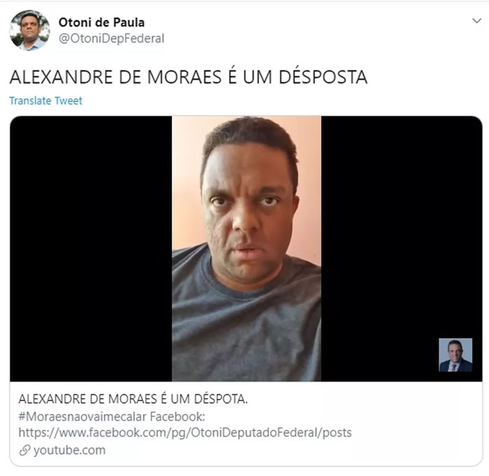 O deputado federal Otoni de Paula (PSC-RJ), pastor evangélico e um dos vice-líderes do governo Bolsonaro na Câmara, publicou um vídeo em suas redes sociais atacando e xingando o ministro do Supremo Tribunal Federal (STF) Alexandre de Moraes. O parlamentar critica Moraes pela decisão que libertou o blogueiro Oswaldo Eustaquio, mas o proibiu de usar as redes sociais.